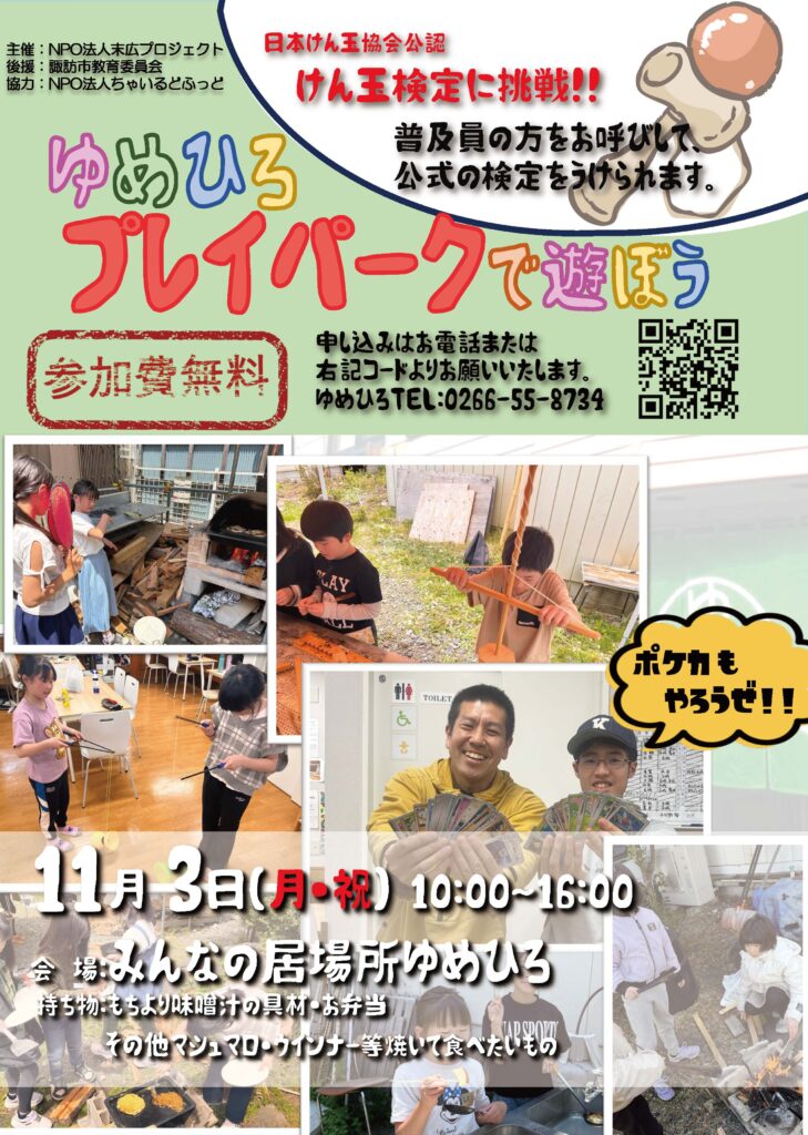 2025年10月15日 / 最終更新日時 : 2025年10月15日 ゆめひろ おしらせ 11月のゆめひろプレイパーク 3日(月祝)に、11月のゆめひろプレイパークをやります。今回のテーマは「けん玉検定に挑戦しよう」です。くわしくはちらしを見てください。 1103ゆめひろチラシ Follow me! FacebooktwitterHatenaPocketCopy