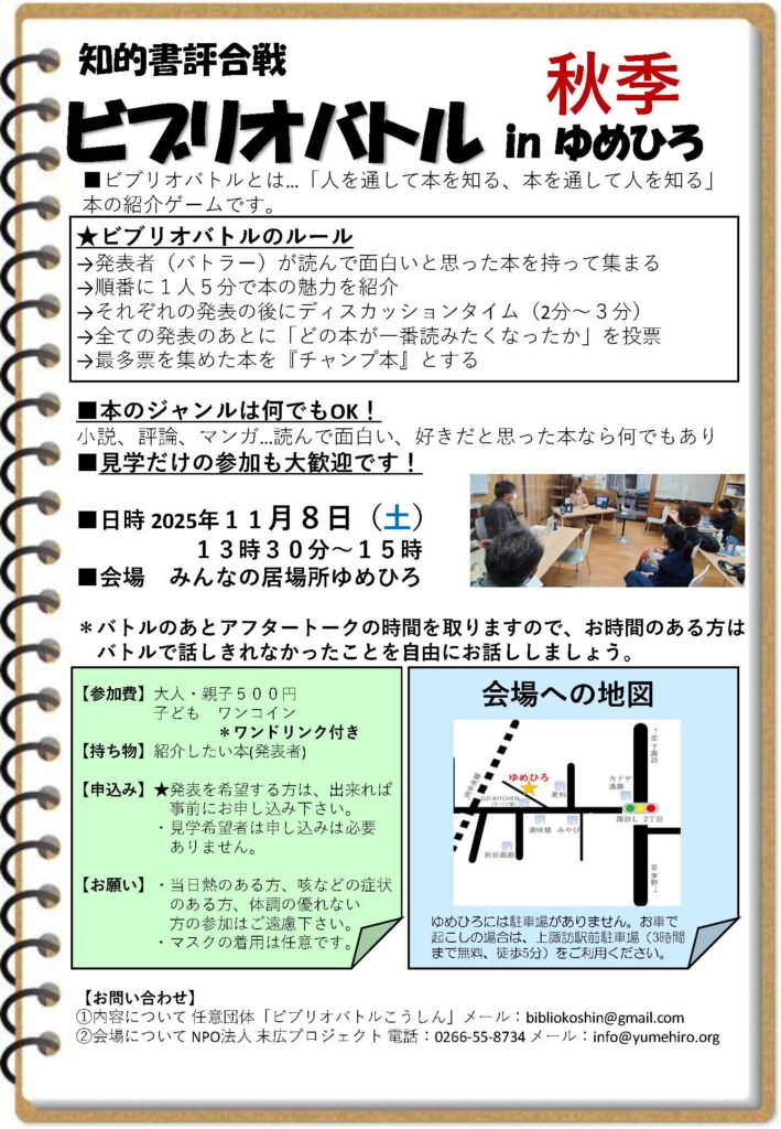 2025年10月15日 / 最終更新日時 : 2025年10月15日 ゆめひろ おしらせ 秋のビブリオバトルinゆめひろ 11月8日(土)に、秋のビブリオバトルinゆめひろを開催します。本好きの方、ぜひご参加ください。詳しくはちらしでご確認ください。 20251108ビブリオバトルチラシ Follow me! FacebooktwitterHatenaPocketCopy