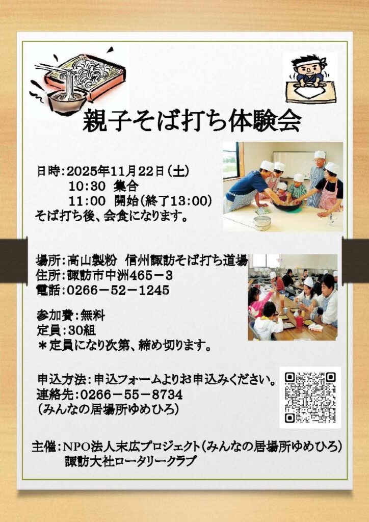 2025年10月22日 / 最終更新日時 : 2025年10月24日 ゆめひろ おしらせ 親子そば打ち体験会 【お詫び】親子そば打ち体験会は定員に達しましたので、受付を終了いたしました。 11月22日(土)に、諏訪大社ロータリークラブ様のご支援を得て、親子そば打ち体験会を行います。詳細はちらしをご覧ください。 2025そば打ちチラシ(最終) Follow me! FacebooktwitterHatenaPocketCopy