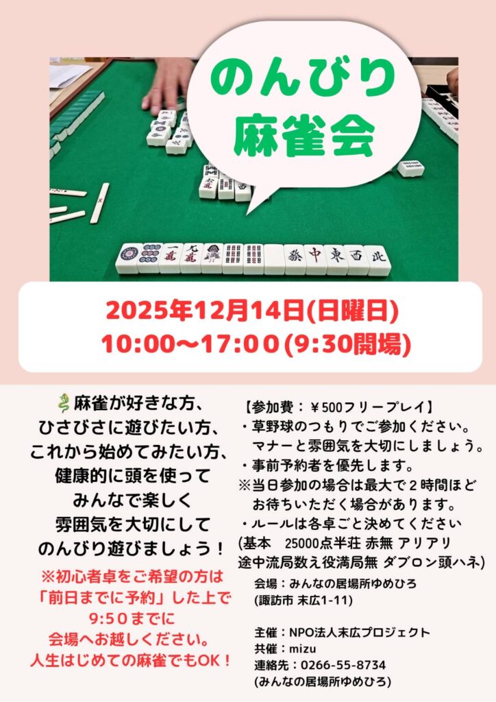 2025年12月1日 / 最終更新日時 : 2025年12月1日 ゆめひろ おしらせ 12月ののんびり麻雀会 14日(日)、のんびり麻雀会が開催されます。詳しくはちらしをご覧ください。 Follow me! FacebooktwitterHatenaPocketCopy