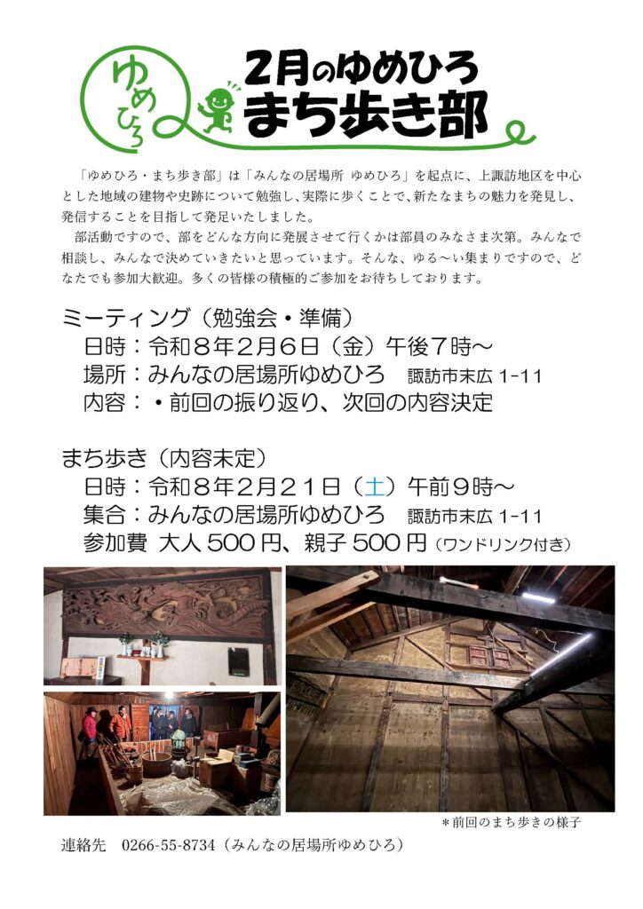 2026年2月4日 / 最終更新日時 : 2026年2月4日 ゆめひろ おしらせ 2月のまち歩き部 2月のまち歩き部は、6日(金)にミーティングを、21日(土)にまち歩きを行います。まち歩きの詳細は6日のミーティングで決めます。lくわしくはちらしでご確認ください。 202602060221まち歩き部案内 Follow me! FacebooktwitterHatenaPocketCopy
