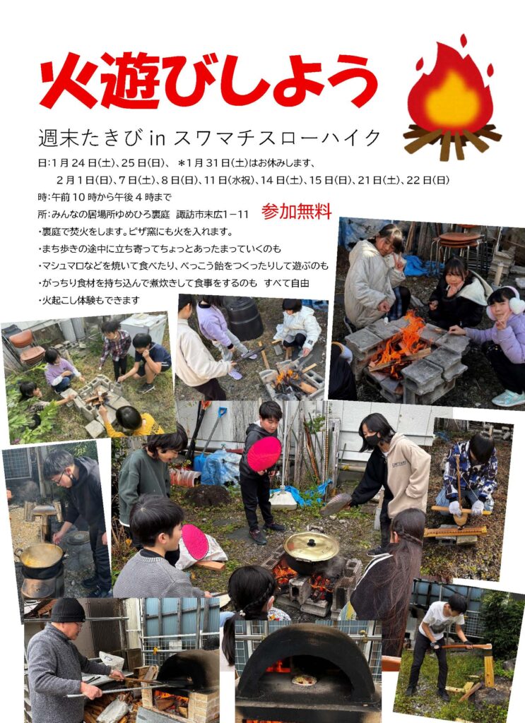 ゆめひろは、「もっと! スローハイクな2日間に参加します。7日(土)は、「火遊びしよう!」「ほんだな商店街」で参加し、同時開催の「かみすわ一箱古本市」「アイスキャンドル2026」にも協力します。8日(日)は、「火遊びしよう!」「ほんだな商店街」で参加し、「諏訪湖の詩 ~湖の呟き&スケッチ、重い~ 歌う会」様のワークショップ会場にもなります。ぜひお出かけください。