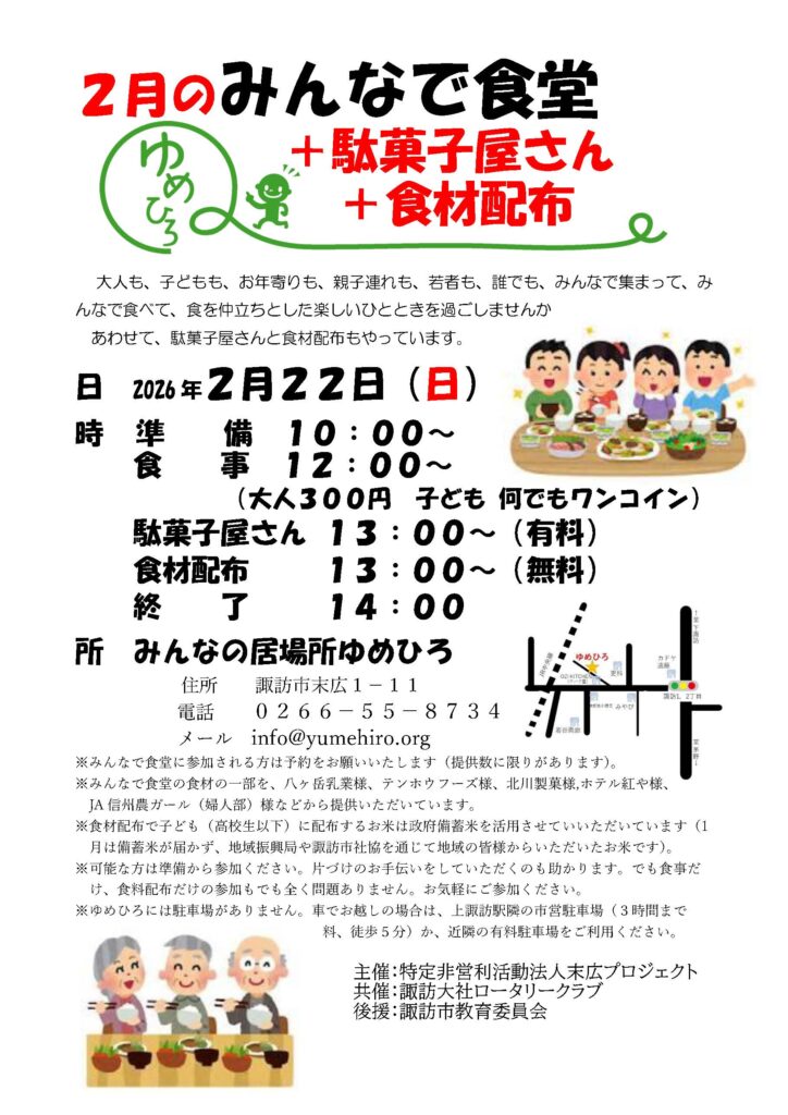 2026年2月5日 / 最終更新日時 : 2026年2月6日 ゆめひろ おしらせ 2月のみんなで食堂 22日(日)は、2月のみんなで食堂です。詳細についてはちらしでご確認ください。今回の昼食のメニューは、ちらし寿司です。ご希望の方は事前のご予約をお願いいたします。 20260222みんなで食堂ちらし Follow me! FacebooktwitterHatenaPocketCopy