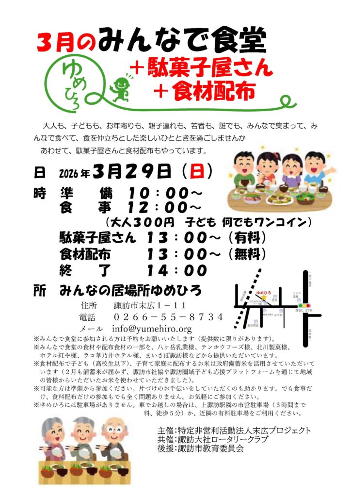 2026年2月27日 / 最終更新日時 : 2026年2月27日 ゆめひろ おしらせ 3月のみんなで食堂 29日(日)、3月のみんなで食堂をやります。詳しくはちらしでご確認ください。 20260329みんなで食堂ちらし Follow me! FacebooktwitterHatenaPocketCopy