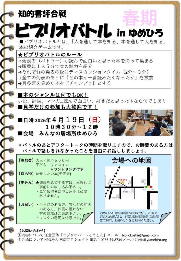 2026年3月22日 / 最終更新日時 : 2026年3月22日 ゆめひろ おしらせ 春のビブリオバトルinゆめひろ 4月19日(日)午前10時30分から、春のビブリオバトルを開催します。詳しくはちらしでご確認ください。 20260419ビブリオバトルチラシ Follow me! FacebooktwitterHatenaPocketCopy
