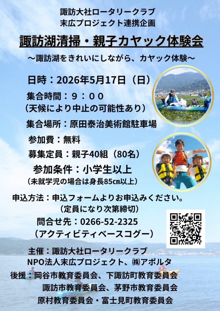5月17日(日)、諏訪大社ロータリークラブ様、(株)アポルタ様との共催で、諏訪湖清掃・親子カヤック体験会を開催します。詳しくはちらしでご確認のうえ、ご希望の方はQRコードからお申込みください。