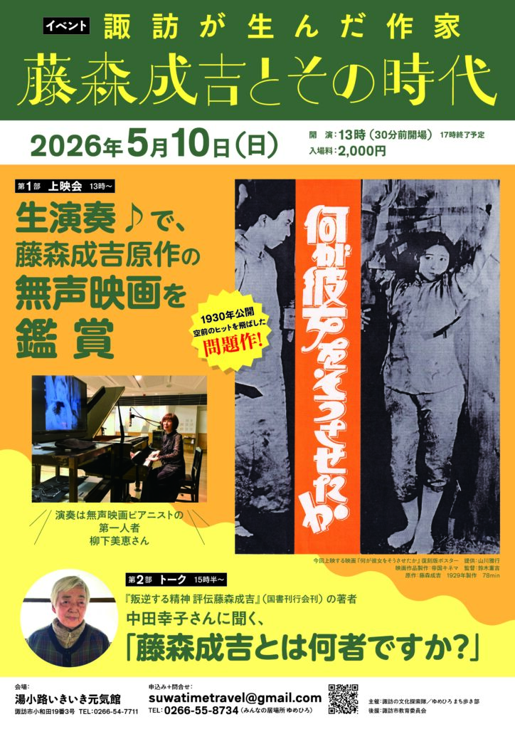 5月10日(日)、生演奏による無声映画『何が彼女をそうさせたか』上映会&トークイベント「諏訪が生んだ作家 藤森成吉とその時代」を開催いたします。詳細はちらしをごらんいただき、参加ご希望の方はQRコードからお申込みください。