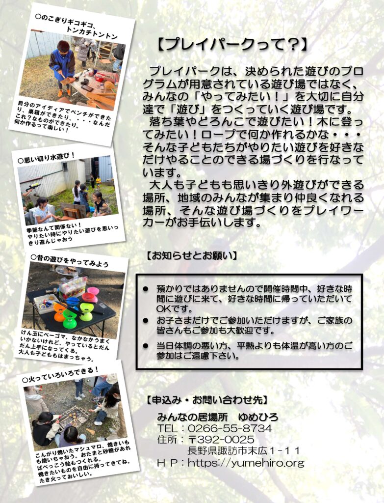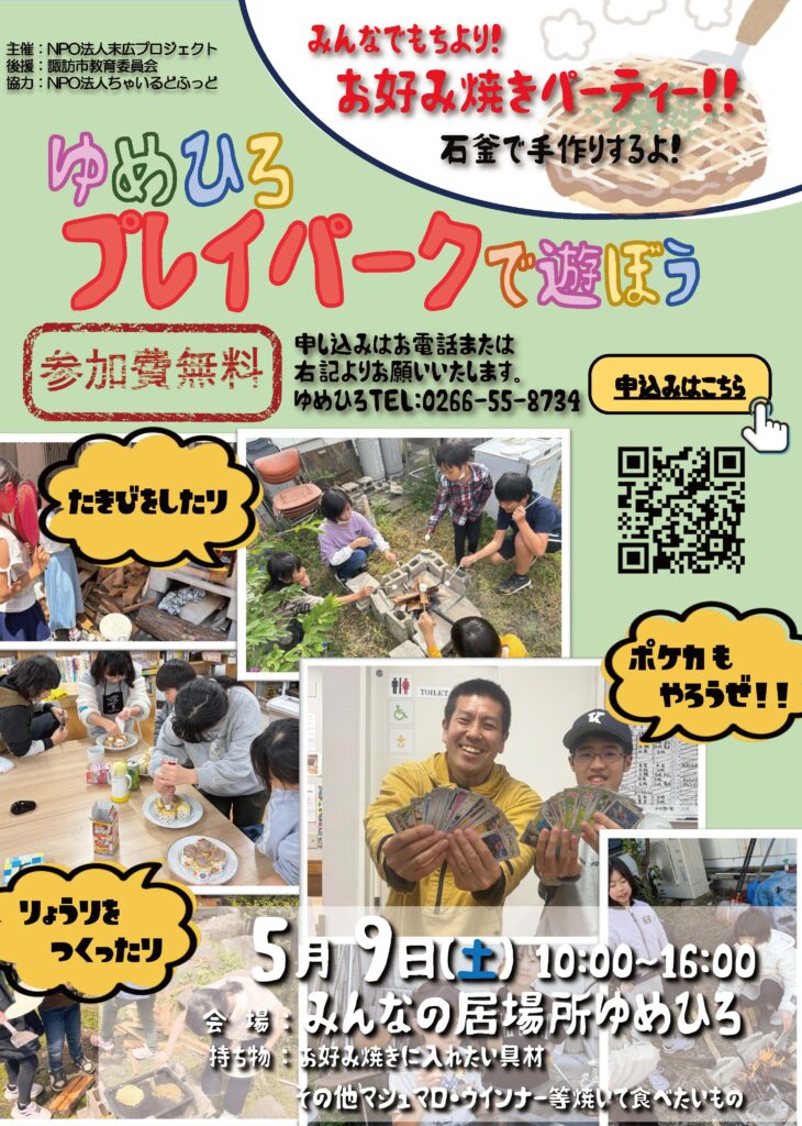 2026年4月24日 / 最終更新日時 : 2026年4月24日 ゆめひろ おしらせ 5月のゆめひろプレイパーク 9日(土)に5月のゆめひろプレイパークを行います。今回のテーマは「みんなでもちより! お好み焼きパーティー‼ 石窯で手作りするよ!」です。くわしくはちらしで確認してください。 0509ゆめひろチラシ (4) Follow me! FacebooktwitterHatenaPocketCopy
